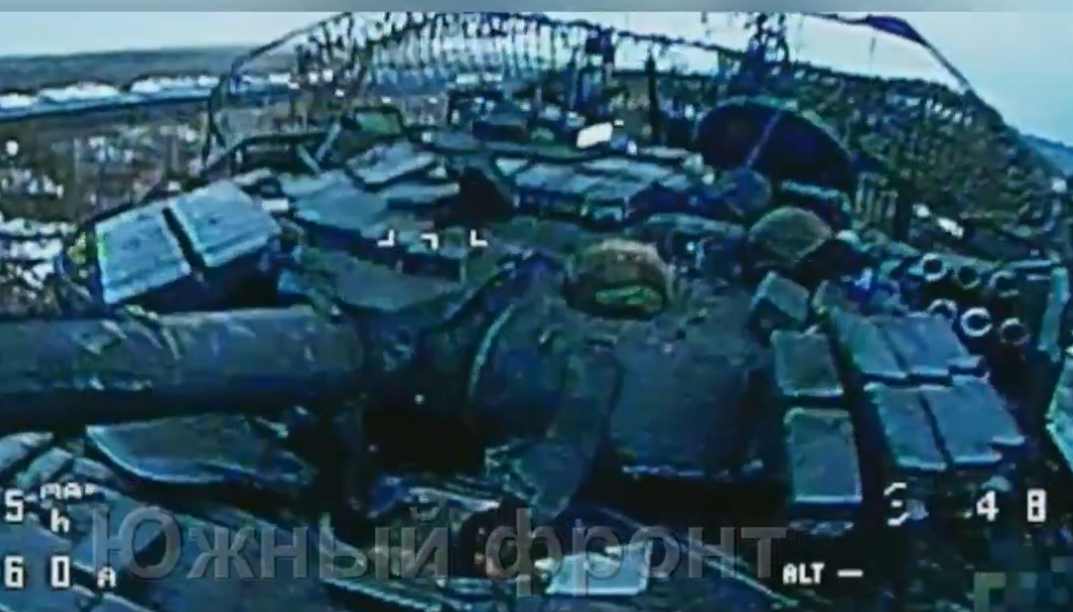 В данном случае механик-водитель Т-72, оказавшись под воздействием «беспокоящего огня», высунулся из люка и заметил приближающийся FPV-дрон. Понимая угрозу, он попытался вернуться внутрь и закрыть люк, однако сделать этого не успел. Последовавшие удары беспилотников зафиксировали финальную стадию — возгорание и детонацию, после которых танк был полностью выведен из строя.