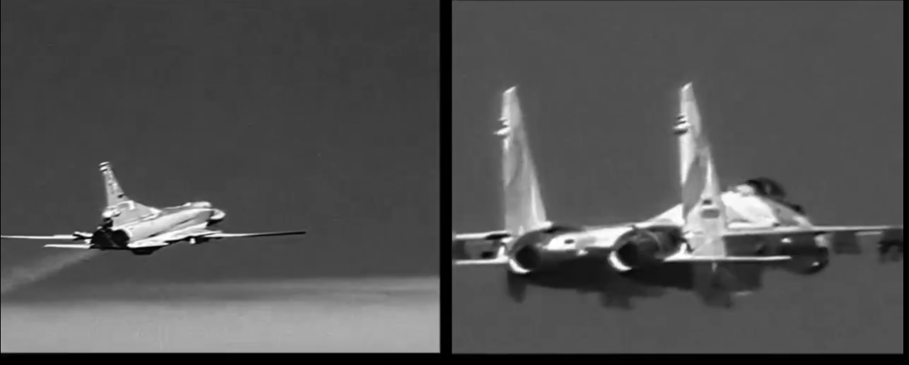 На опубликованной записи видно, как камера французского летчика крупным планом фиксирует кили бомбардировщика и сопровождающего истребителя с нанесенными регистрационными номерами. При этом заметно, что цифровое увеличение работает с выраженными ступенчатыми переходами и крупным шагом зума.