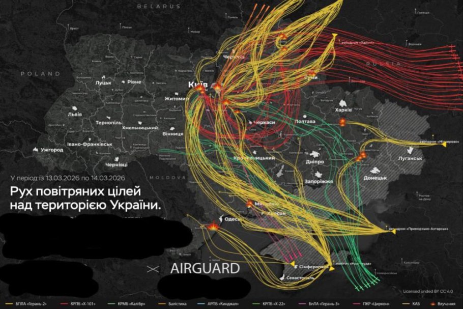 Мониторинговые ресурсы противника опубликовали схему массированного удара, нанесенного ВС РФ по военным объектам и энергетической инфраструктуре Украины в ночь на 14 марта. Согласно их данным, основным направлением атаки стали Киев и Киевская область.