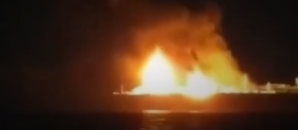 Первый канал опубликовал видеозапись, на которой запечатлен газовоз «Арктик Метагаз», охваченный огнем после атаки в Средиземном море. Кадры были сняты в темное время суток. На записи видно, что судно горит, а над палубой поднимаются крупные языки пламени и густой дым.
