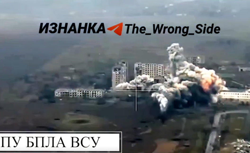 Судя по опубликованным материалам, речь идет о многоэтажной застройке на окраине населенного пункта. Несколько жилых домов в этом районе уже имеют значительные повреждения. После сброса ФАБ-3000 боеприпас поражает одну из многоэтажек. В результате прилета здание практически мгновенно обрушивается: конструкция складывается, и от строения остается лишь одна секция.