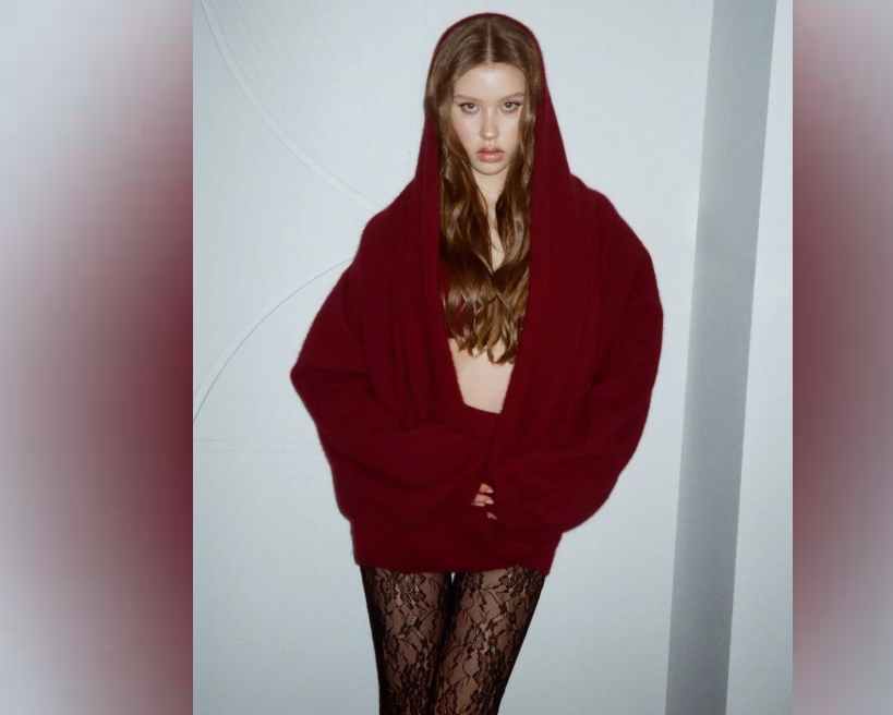 Звезда фильма «Алиса в Стране Чудес» примерила бордовый вязаный комплект, состоящий из мини-юбки, лифа и кардигана с капюшоном. Образ был дополнен черными кружевными колготками и высокими сапогами на каблуке. Для съемки актриса распустила волосы, слегка уложив их волнами, и сделала макияж с акцентом на глаза и губы.