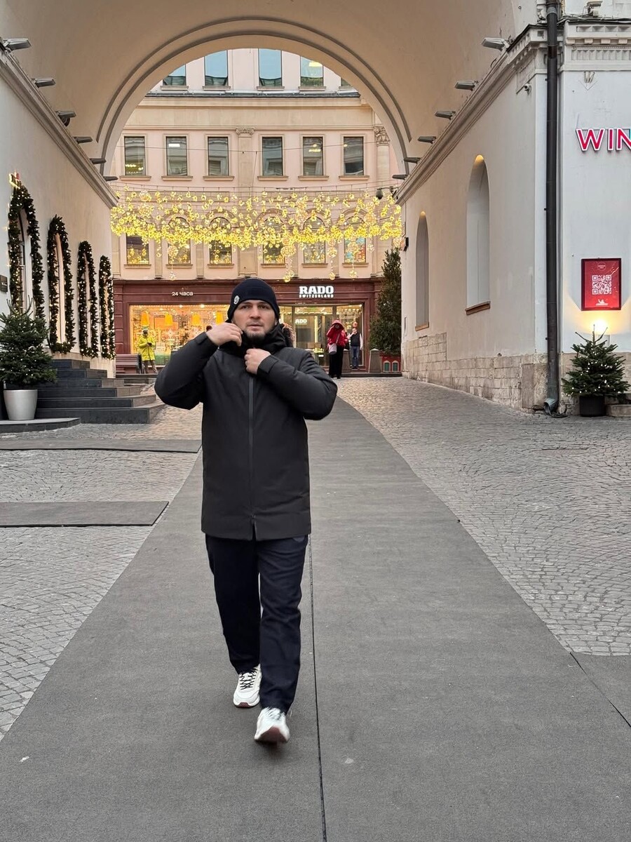 На опубликованных снимках Нурмагомедов запечатлен в повседневном образе. Он выбрал черные спортивные штаны, парку и шапку в тон, дополнив образ белыми кроссовками. В кадр также попали украшенные новогодней иллюминацией улицы столицы, которые стали фоном для прогулки спортсмена.