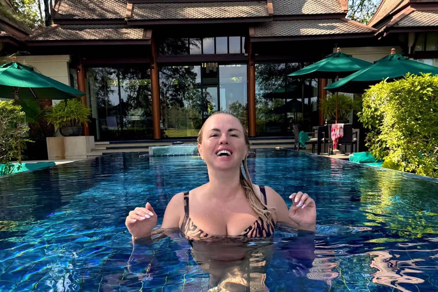 На фото 45-летняя Анна Семенович позирует в раздельном леопардовом купальнике с декольте. Артистка предстала с мокрыми распущенными волосами и без макияжа, находясь в бассейне. Кадр выполнен в непринужденной обстановке и передает спокойное, расслабленное настроение.
