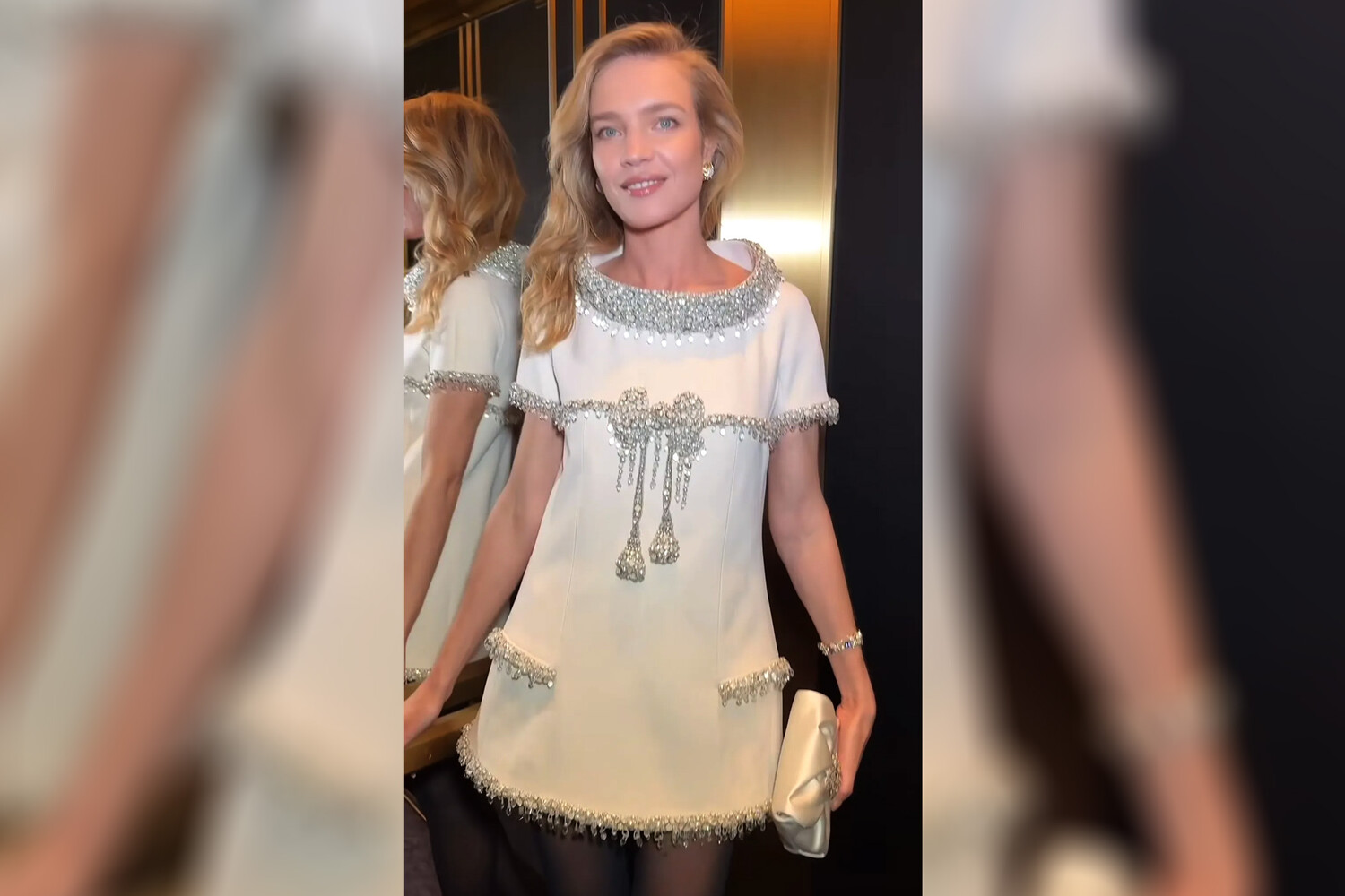 43-летняя модель появилась на светском вечере в коротком белом платье, украшенном стразами. Образ Водянова дополнила черными капроновыми колготками, туфлями на каблуках и изящными серьгами. Волосы звезды подиумов были уложены мягкими локонами, а макияж выполнен в естественных, нюдовых тонах.