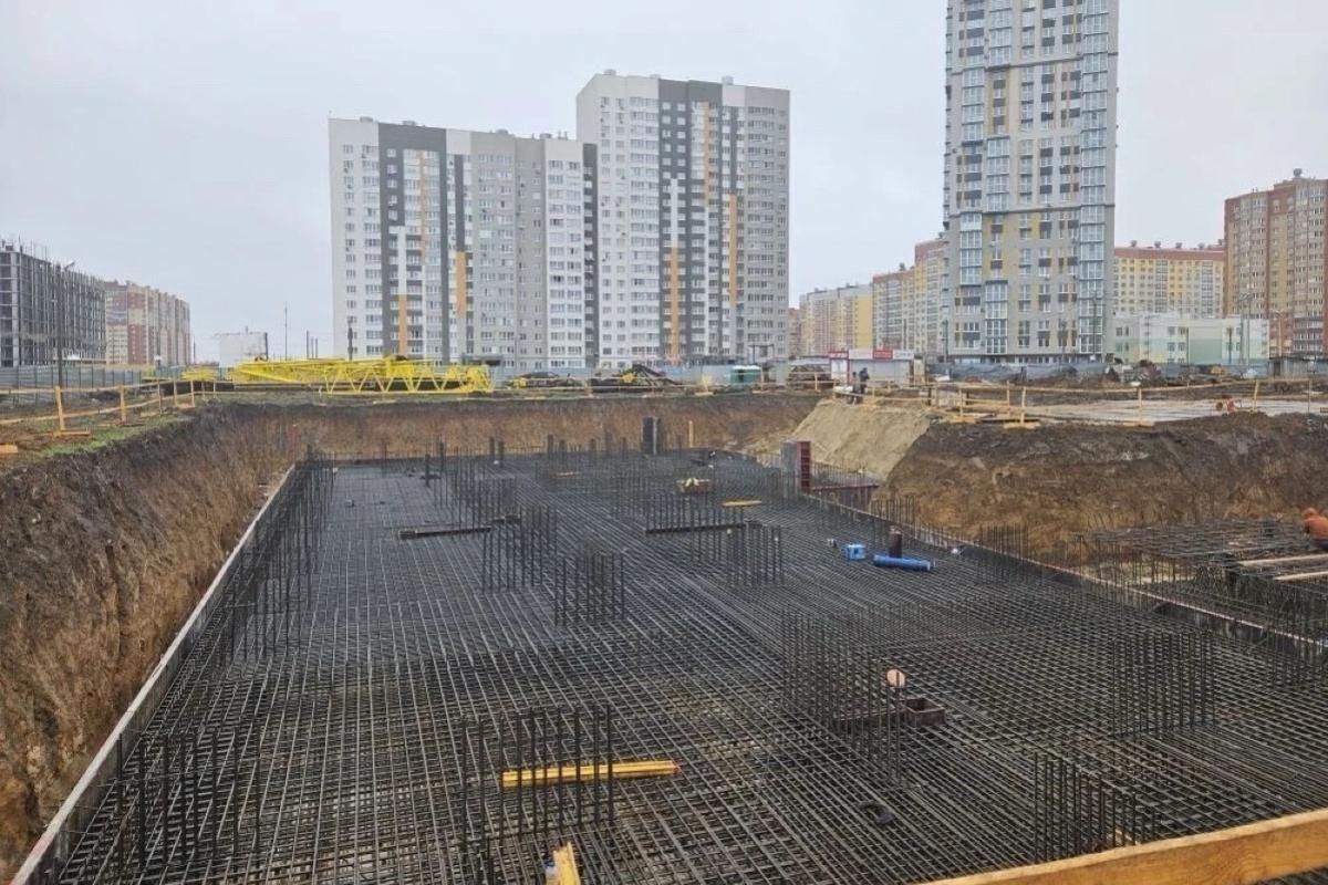 Проект предусматривает возведение дома, состоящего из трех секций разной этажности. В настоящее время специалисты сосредоточены на первой секции. На площадке формируют каркас фундамента, для которого использовано почти 130 тонн арматуры.