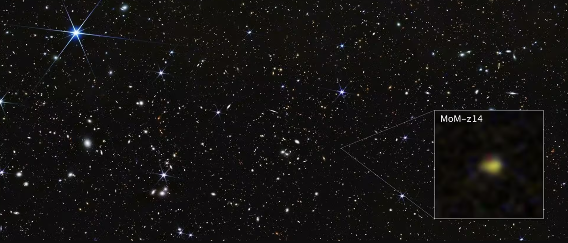 Астрономы при помощи космического телескопа «Джеймс Уэбб» обнаружили самую далёкую из известных на сегодняшний день галактик. Объект получил обозначение MoM-z14, а свет от него шёл к Земле около 13,5 миллиарда лет. Это означает, что галактика существовала всего через 280 миллионов лет после Большого взрыва. Для сравнения, формирование Млечного Пути, как считают учёные, началось примерно через 800 миллионов лет после рождения Вселенной.