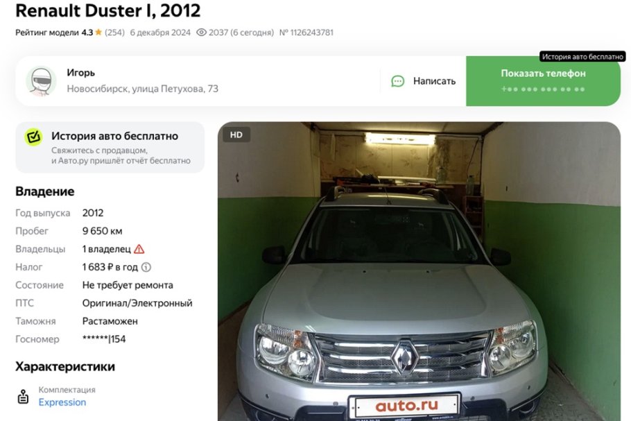 В Новосибирске в продаже обнаружен Renault Duster 2012 года выпуска с крайне небольшим пробегом. О необычном предложении сообщает «Российская газета». Кроссовер был произведен в декабре 2012 года и за прошедшие 14 лет проехал менее 10 тысяч километров.