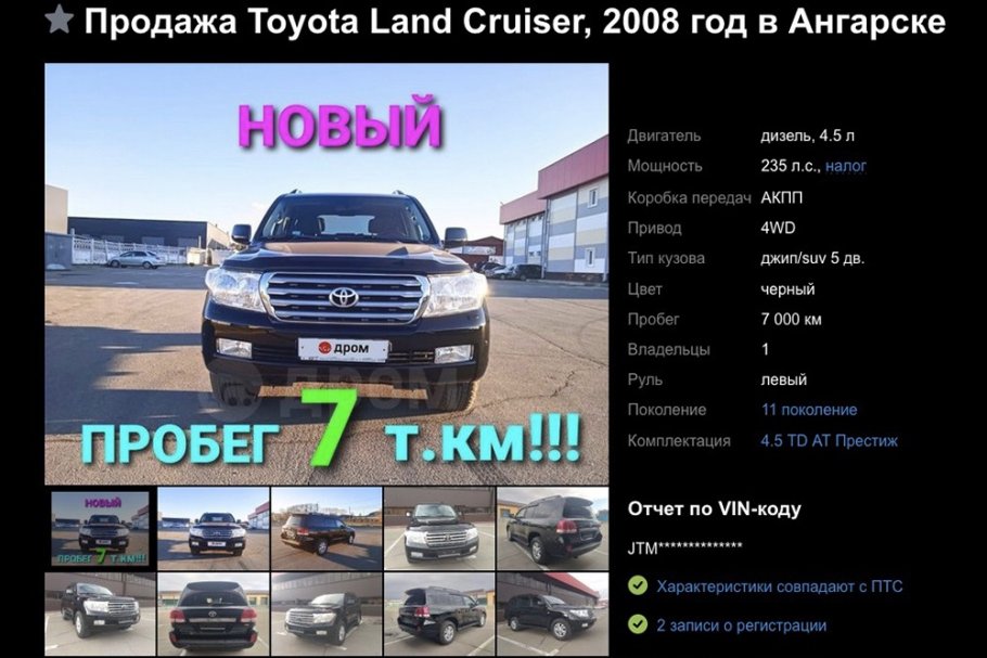В Ангарске на продажу выставлен редкий по нынешним меркам экземпляр Toyota Land Cruiser 200 2008 года выпуска. Речь идет о внедорожнике, который за все время эксплуатации имел одного владельца. Автомобиль был приобретен у официального дилера в 2009 году и с тех пор практически не использовался.